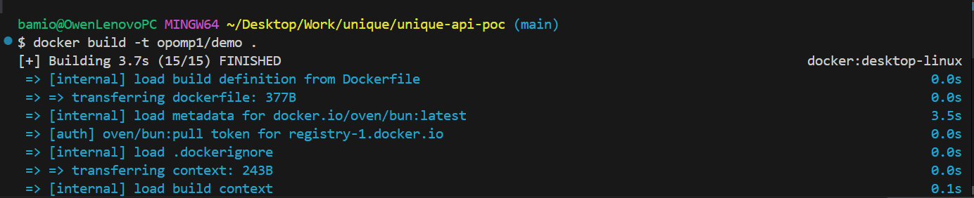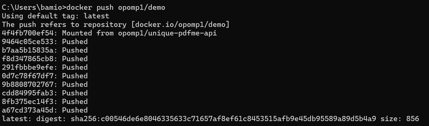 โดยผมจะรันคำสั่ง docker build -t opomp1/demo . เพราะ docker hub username ของผมคือ opomp1 และผมต้องการตั้งชื่อ image นี้ว่า demo ต่อไปเราจะทำการ push image นี้ขึ้นไปเก็บไว้บน Docker Hub