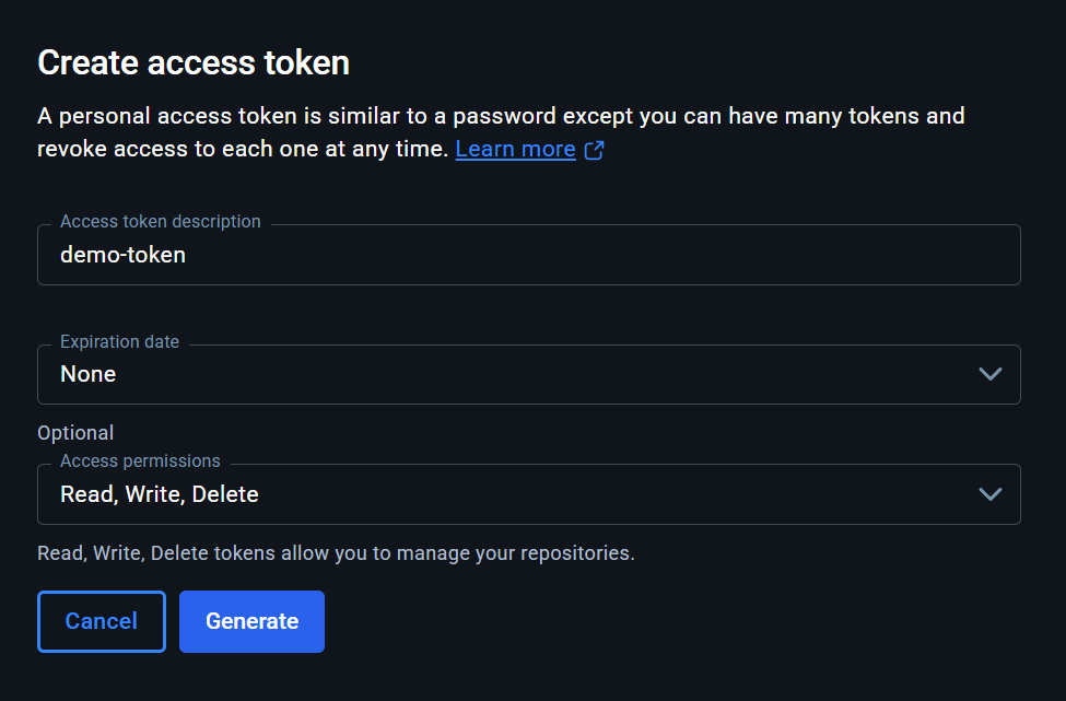 ให้เราใส่ description ให้ token จะได้จำได้ว่าใช้สำหรับอะไร จากนั้นกำหนดวันหมดอายุ และ permission ผมจะใส่ description เป็น demo-token ไม่กำหนดวันหมดอายุ และให้ให้สิทธิ์ในการ Read, Write, Delete