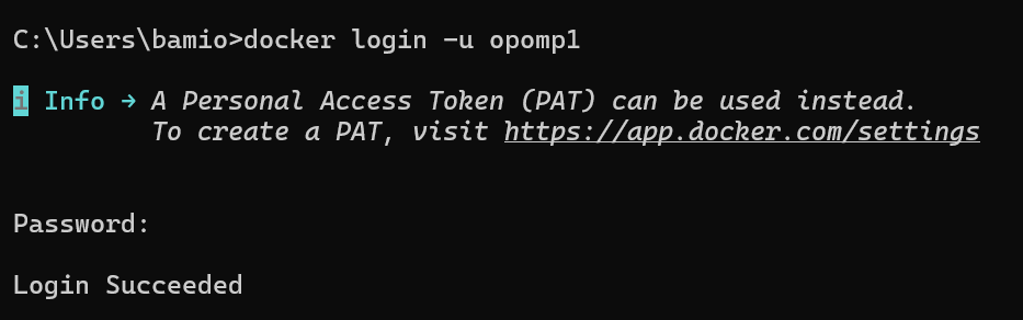 docker login -u <docker-username>จากนั้นเราจะต้องพิมพ์ Password ของเราลงไป (หรือเราสามารถก็อป Docker Access Token ที่เราสร้างขึ้นก่อนหน้านี้มาใส่เพื่อใช้แทน Password ได้ด้วยก็ได้) หลังจากนั้นให้กด enter ระหว่างพิมพ์หรือวาง Token อาจจะ ไม่ขึ้นตัวอักษรใด ๆ บนหน้าจอ (อย่าตกใจไป ถือว่าเป็นปกติ เพื่อความปลอดภัย)