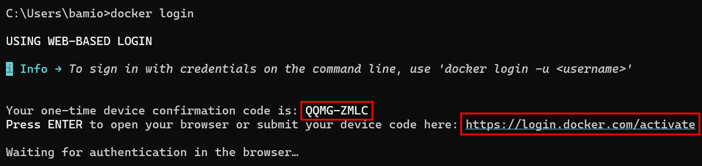 docker loginจากนั้นจะมีลิงค์ขึ้นมาพร้อทกับ confirmation code ให้เรากดลิงค์เผื่อล็อกอินผ่านเว็บ ก็อป confirmation code ไปวาง และกด confirm เท่านี้ก็ล็อกอินได้แล้ว