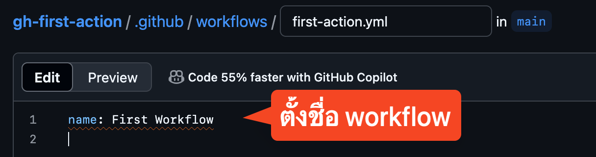เราจะตั้งชื่อ workflow ด้วย keyword name: