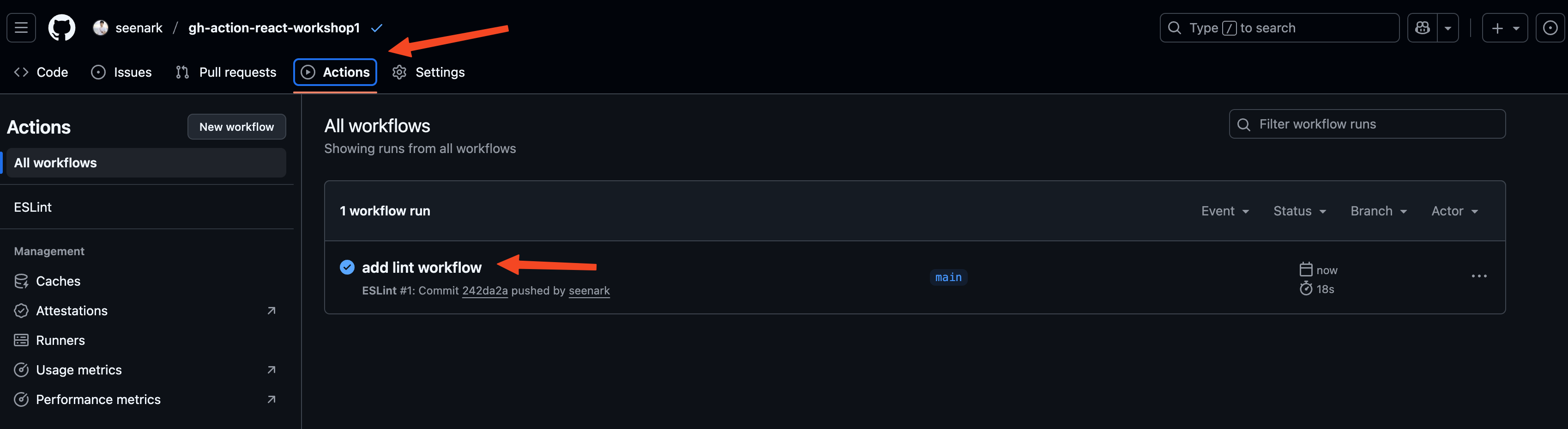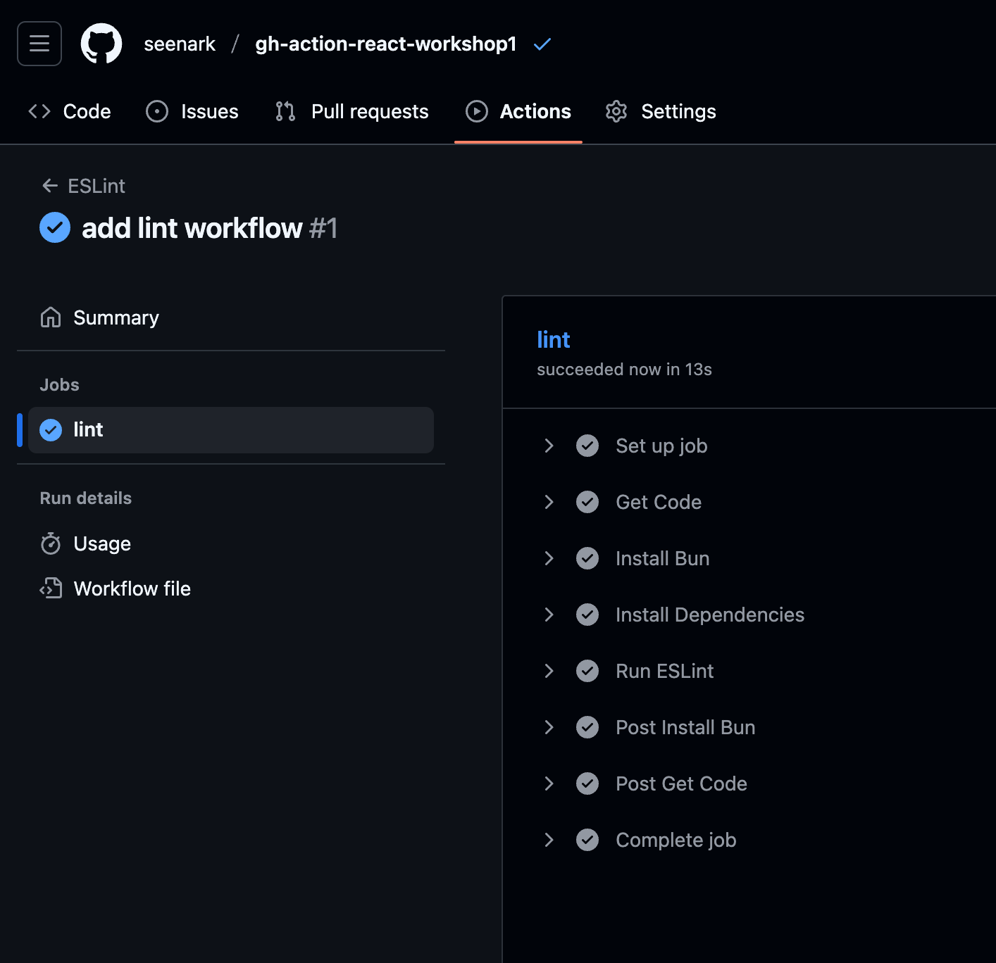 name: ESLinton: pushjobs: lint: runs-on: ubuntu-latest steps: - name: Get Code uses: actions/checkout@v4 - name: Install Bun uses: oven-sh/setup-bun@v2 with: bun-version: 1.2.8 - name: Install Dependencies run: bun i - name: Run ESLint run: bun run lintจะเห็นว่าเราใช้ action จาก Marketplace ด้วย