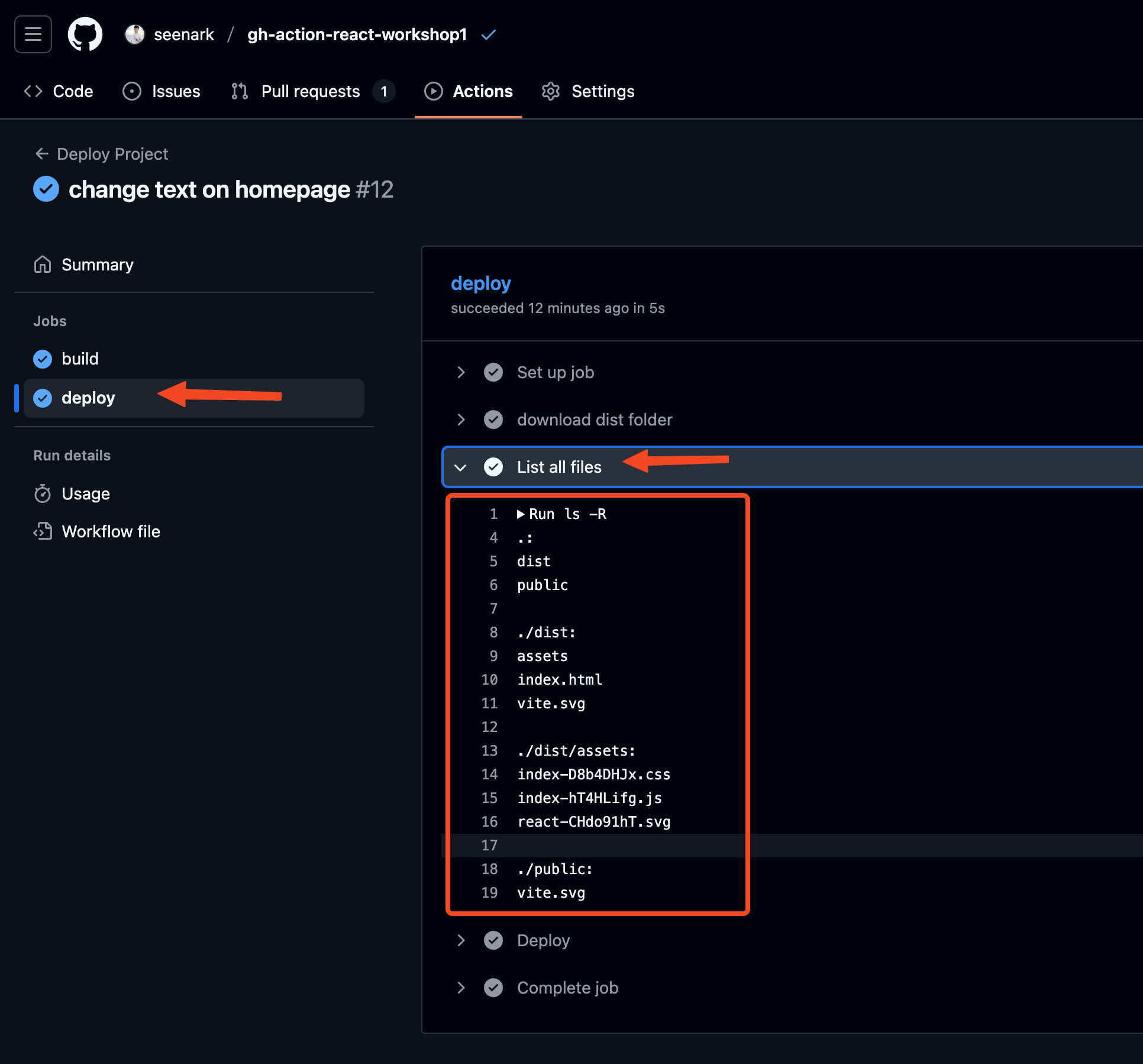 deploy: needs: - build runs-on: ubuntu-latest steps: - name: download dist folder uses: actions/download-artifact@v4 with: name: dist-folder - name: List all files run: ls -R - name: Deploy run: echo "Deploying..."ลองเปิดดูที่หน้าเว็ป