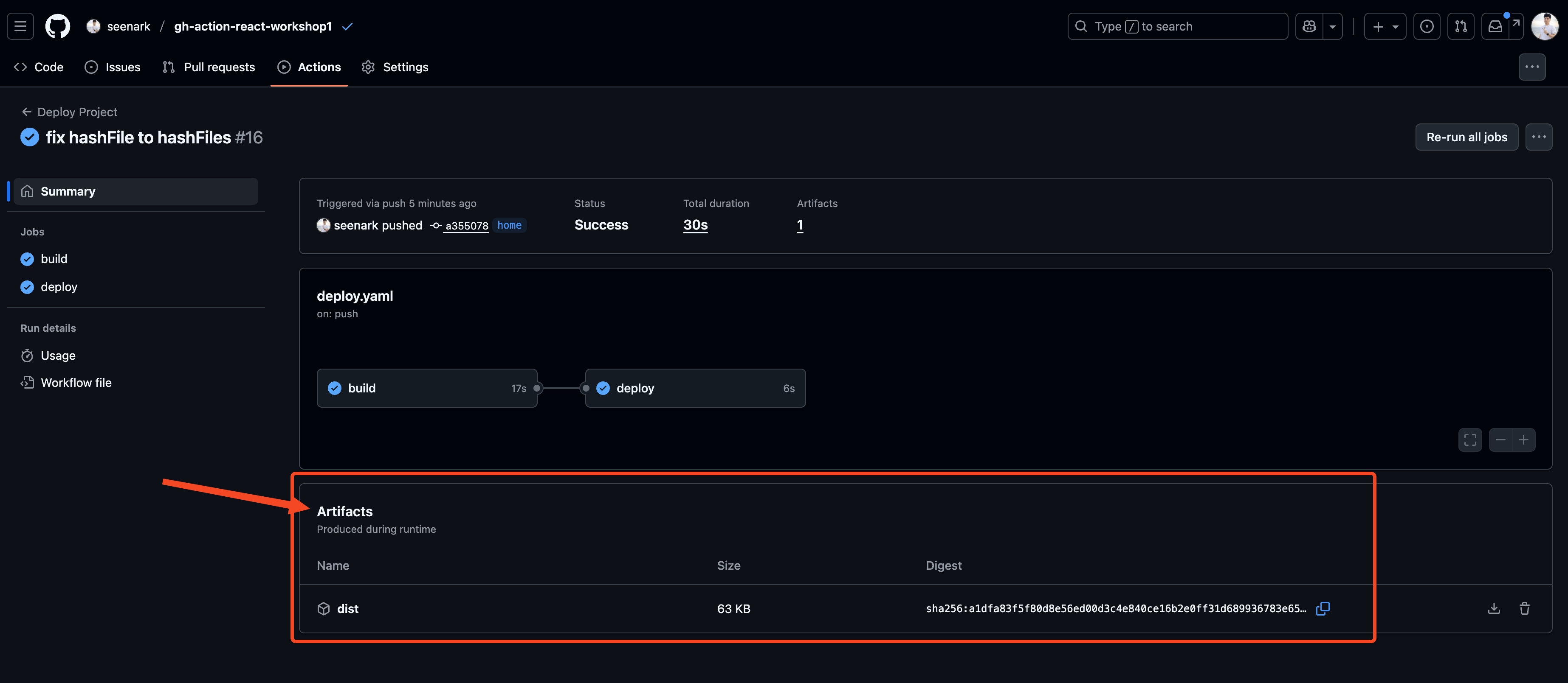 Artifact คือไฟล์หรือโฟลเดอร์ที่เกิดขึ้นจากการรัน GitHub Actions workflow ที่เราต้องการเก็บไว้ใช้งานต่อ เช่น ไฟล์ที่ build เสร็จแล้ว, dist folder จากการ build react csr, testing report, หรือ log files