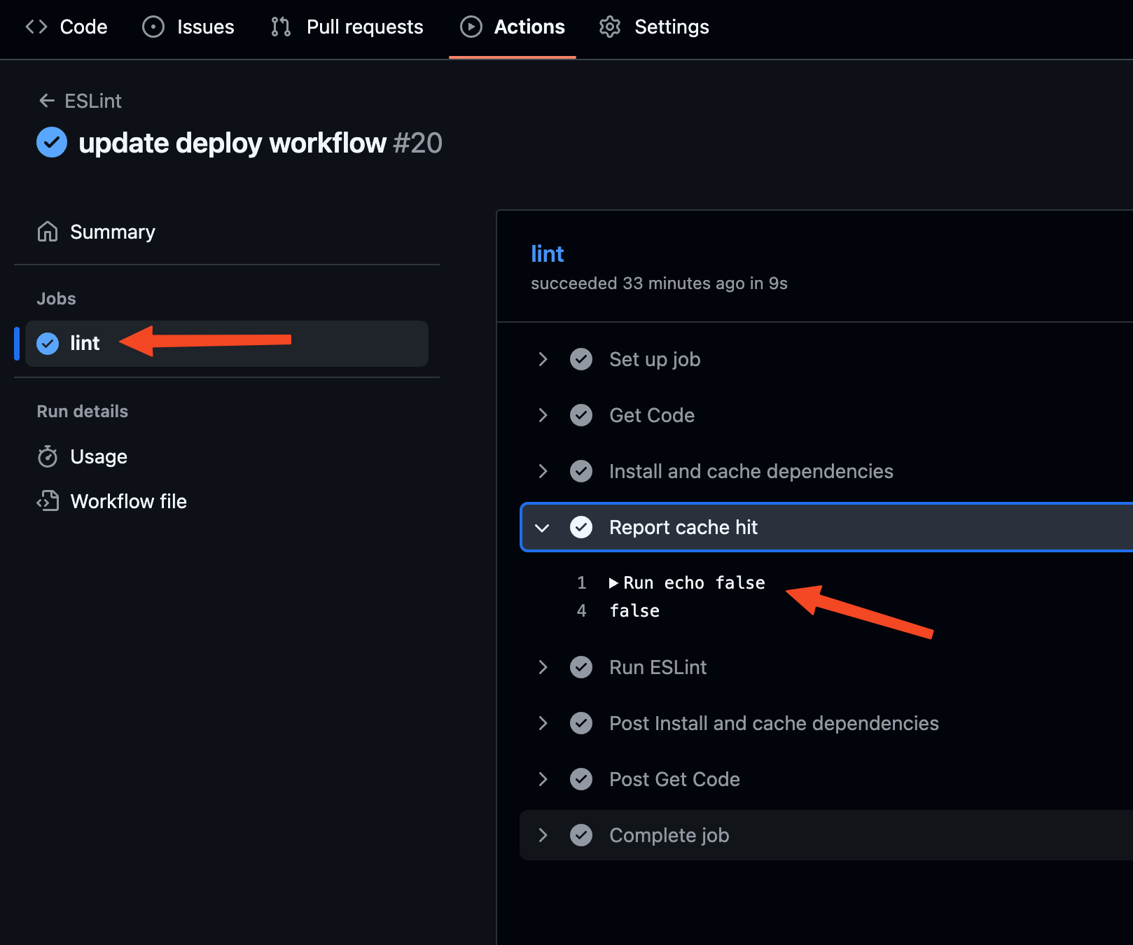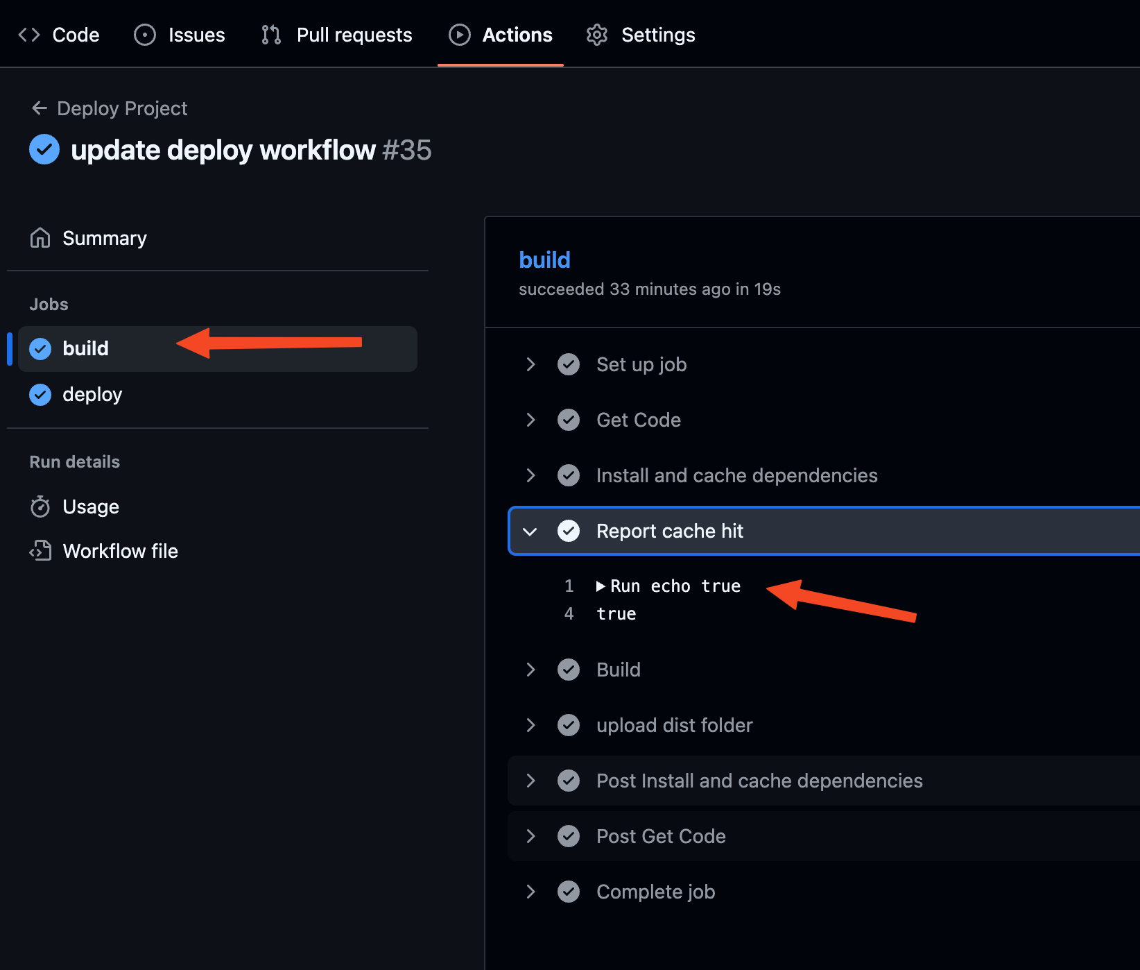 - name: Report cache hit run: echo ${{ steps.cache-deps.outputs.cache-hit }}28 collapsed lines